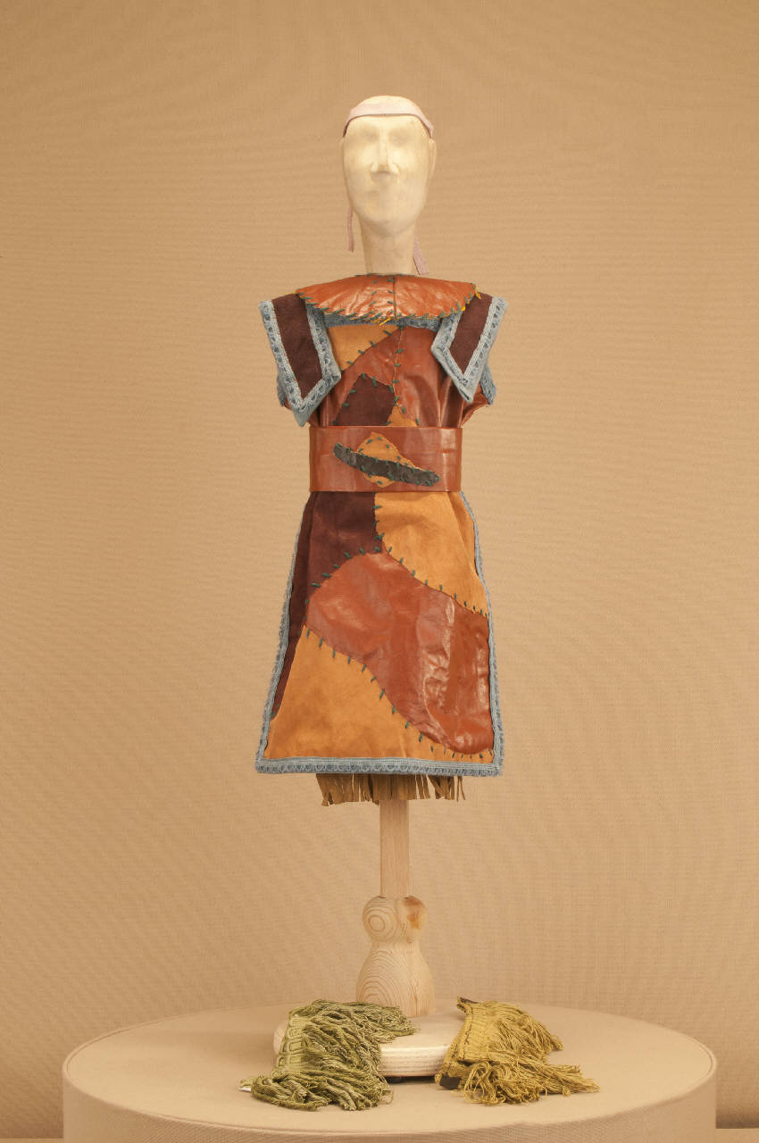 - NOTIZIE STORICO CRITICHE Il costume si completa con un paio di calzature in stile. Lo spettacolo "La leggenda di Pocahontas"andò in scena per la prima volta al "Spoleto Festival USA" di Charleston nel 1989, su precisa richiesta degli spettatori che chiedevano ai Colla uno spettacolo sulla loro epopea. Si trattava di un¿azione mimica su soggetto di Elisabetta Di Mambro ed Eugenio Monti con scene di Pierluigi Bottazzi e costumi di Maurizio Dotti. Le musiche di Alfredo Lacosegliaz ripetevano temi folcloristici antichi delle popolazioni indiane mescolati a motivi di musica europea dell¿età barocca. Nel 1996 Eugenio Monti riscrisse lo spettacolo, trasformandolo in azione drammaturgica, affidando la parte musicale a Danilo Lorenzini e la parte scenografica a Franco Citterio. Vennero rifatti numerosi costumi, su ideazione di Eugenio Monti Colla.