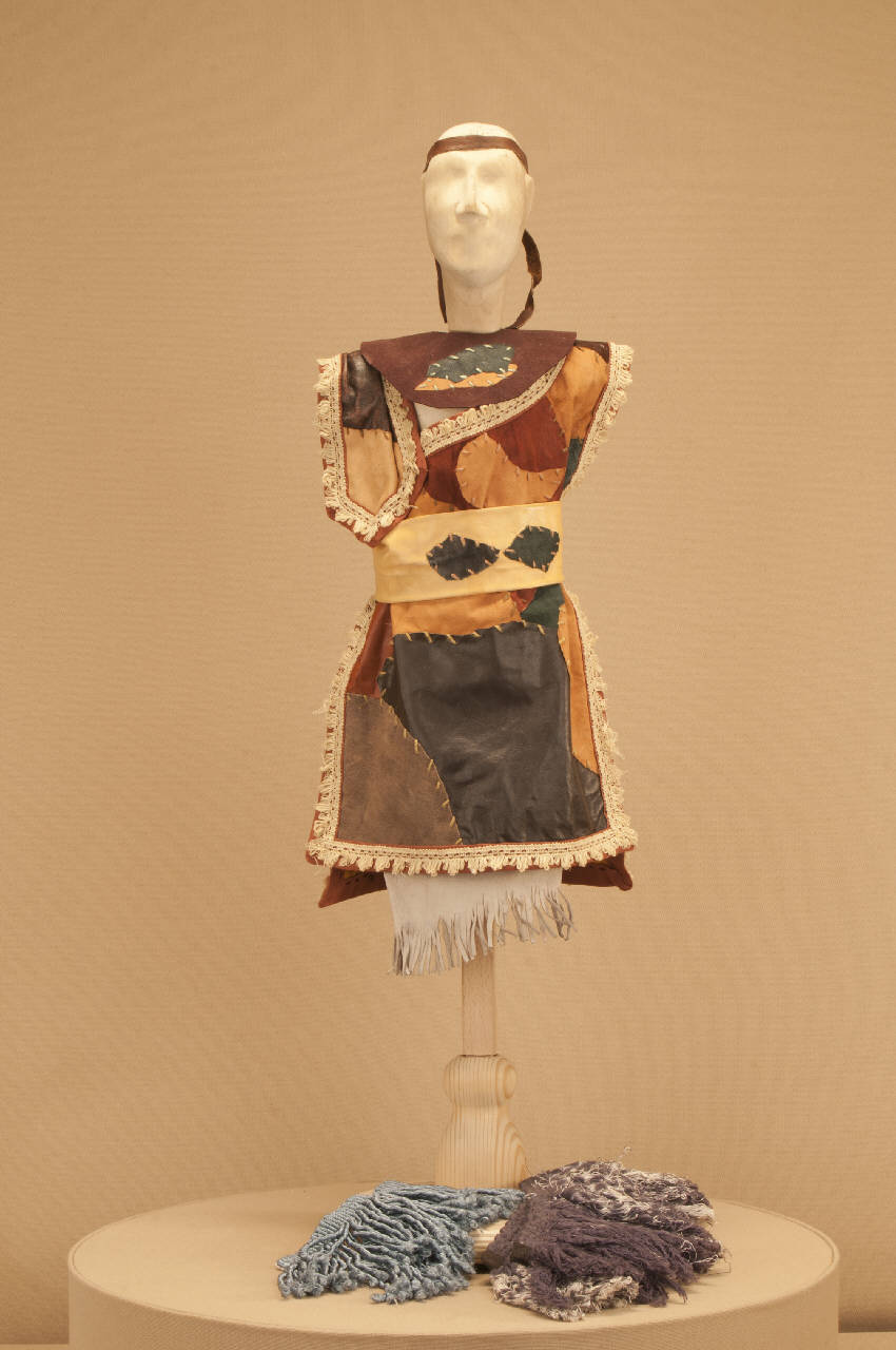 - NOTIZIE STORICO CRITICHE Il costume si completa con un paio di calzature in stile. Lo spettacolo "La leggenda di Pocahontas"andò in scena per la prima volta al "Spoleto Festival USA" di Charleston nel 1989, su precisa richiesta degli spettatori che chiedevano ai Colla uno spettacolo sulla loro epopea. Si trattava di un¿azione mimica su soggetto di Elisabetta Di Mambro ed Eugenio Monti con scene di Pierluigi Bottazzi e costumi di Maurizio Dotti. Le musiche di Alfredo Lacosegliaz ripetevano temi folcloristici antichi delle popolazioni indiane mescolati a motivi di musica europea dell¿età barocca. Nel 1996 Eugenio Monti riscrisse lo spettacolo, trasformandolo in azione drammaturgica, affidando la parte musicale a Danilo Lorenzini e la parte scenografica a Franco Citterio. Vennero rifatti numerosi costumi, su ideazione di Eugenio Monti Colla.