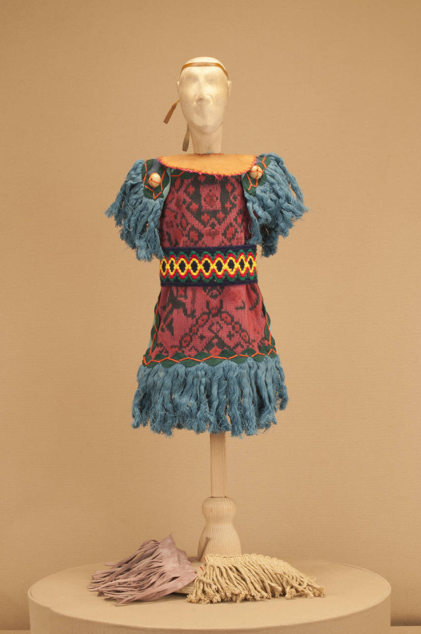 - NOTIZIE STORICO CRITICHE Il costume si completa con un paio di calzature in stile. Lo spettacolo "La leggenda di Pocahontas" andò in scena per la prima volta al "Spoleto Festival USA" di Charleston nel 1989, su precisa richiesta degli spettatori che chiedevano ai Colla uno spettacolo sulla loro epopea. Si trattava di un¿azione mimica su soggetto di Elisabetta Di Mambro ed Eugenio Monti con scene di Pierluigi Bottazzi e costumi di Maurizio Dotti. Le musiche di Alfredo Lacosegliaz ripetevano temi folcloristici antichi delle popolazioni indiane mescolati a motivi di musica europea dell¿età barocca. Nel 1996 Eugenio Monti riscrisse lo spettacolo, trasformandolo in azione drammaturgica, affidando la parte musicale a Danilo Lorenzini e la parte scenografica a Franco Citterio. Vennero rifatti numerosi costumi, su ideazione di Eugenio Monti Colla.