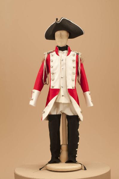 Divisa militare settecentesca, composta da pantaloni, gilet, giacca,colletto, ghette e spalline. Si completa con stivaletti in stile, tricorno con codice GOR18078, 2 giberne con codice GOR18096 e GOR18097.