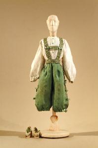 Costume per ballerino inserito in contesto del 1600 composto da pantaloni, camicia, cintura con bretelle, scarpe