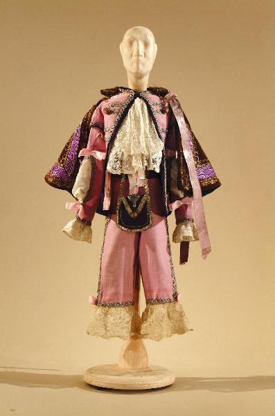 Costume per cavaliere del 1600, composto da pantaloni, giacca, camicia, cintura con borsetta, mantellina, nastro con fiocco