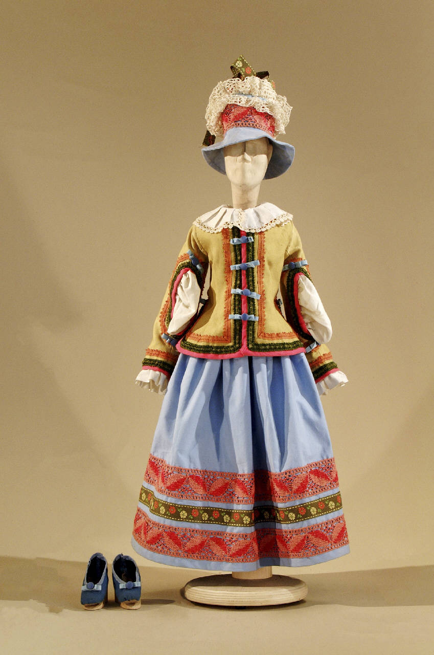 Costume per popolana contadina del 1600 composto da gonna, corpino, cappello e scarpe