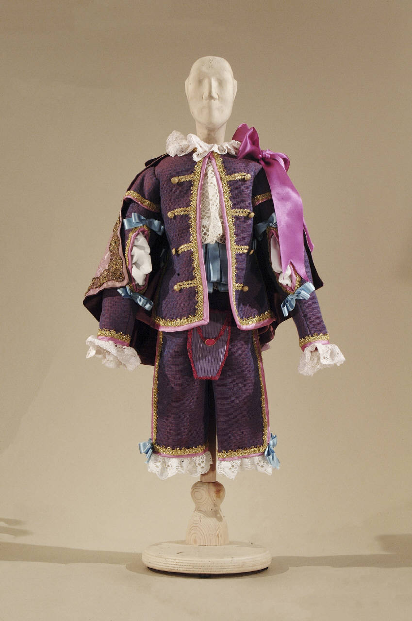 Costume per cavaliere del 1600 composto da pantaloni, giacca, camicia, cintura con borsetta, mantellina, nastro con fiocco