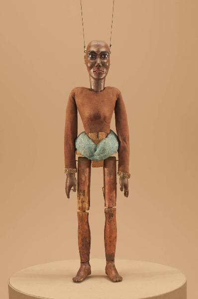 - NOTIZIE STORICO CRITICHE I piedi scolpiti e dipinti e le gambe dipinte significa che la marionetta era usata senza calzature e indumenti che le coprissero le gambe. O che le gambe sono state recuperate da una marionetta che agiva nuda negli arti inferiori. Spilli ricurvi ai lobi delle orecchie per appendere eventuali orecchini. Il busto è composto da due metà incollate. L'incastro del ginocchio è stato rifatto con tasselli di legno innestati e inchiodati.