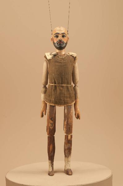 Testa in legno di tiglio fissata al corpo tramite ferro, occhi di vetro. Corpo piccolo in pioppo. Gambe unite al bacino tramite bordione in ferro, ginocchia mobili ad incastro. Mani in tiglio con dita scolpite ma parzialmente unite. Bilancino per coppie.