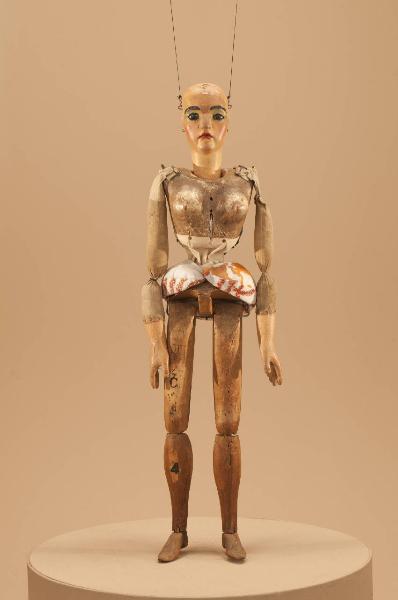 Testa in legno di tiglio fissata al corpo tramite ferro, occhi di vetro. Corpo piccolo in pioppo tagliato in vita e raccordato con viti ad anello e tela. Gambe unite al bacino tramite bordione in ferro, ginocchia mobili ad incastro. Mani in tiglio con dita scolpite ma parzialmente unite. Bilancino per coppie.