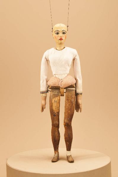 Testa in legno di tiglio fissata al corpo tramite ferro, occhi di vetro. Corpo in pioppo tagliato in vita e raccordato con viti ad anello e tela. Gambe unite al bacino tramite bordione in ferro, ginocchia mobili ad incastro. Mani in tiglio con dita scolpite ma unite. Bilancino per coppie.