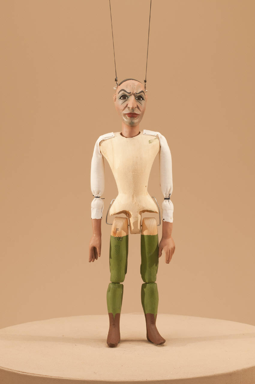 - NOTIZIE STORICO CRITICHE Questo figurino era montato su un carrello che attraversava la scena nello spettacolo Nabucco. Vite ad anello alla sommità del capo. Le gambe sono colorate per evitare con tale espediente l'uso di calzature. La riduzione per marionette dell¿opera "Nabucco" di Giuseppe Verdi nasce nella stagione teatrale 2001/2002 e chiude le manifestazioni per il Centenario della morte del Maestro che la Carlo Colla e Figli aveva celebrato con la messa in scena di "Il Trovatore", nel novembre 2000 e di "Aida", nel febbraio 2001. Secondo la tradizione ottocentesca lo spettacolo presentava una parte in prosa che si alternava con le pagine musicali più celebri della partitura verdiana. L¿azione prendeva l¿avvio con un prologo in cui davanti al Teatro alla Scala, sotto la neve, l¿impresario Merelli consegnava a Verdi il libretto di "Nabucco", secondo quanto lo stesso Verdi scrisse nelle sue memorie.