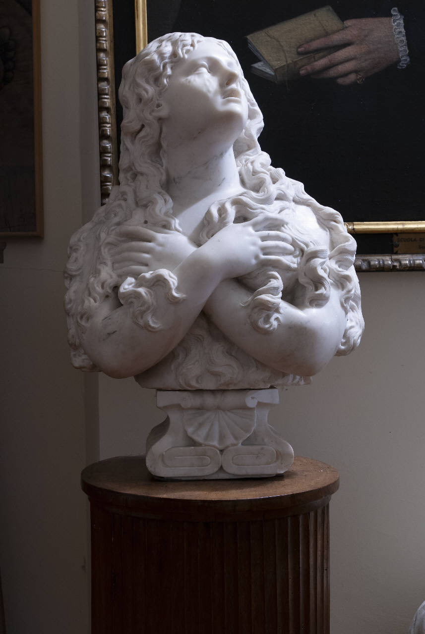 - NOTIZIE STORICO CRITICHE Acquistato da Salvatore Orsetti nel 1804, questo busto, poggiante su una base probabilmente non pertinente, è attribuito allo scultore Anton Maria Pirovano, realizzatore di numerose opere nella chiese della Bergamasca. Santa Maria Maddalena, la cui nudità è coperta dai lunghi e fluenti capelli, è raffigurata con gli occhi pieni di lacrime rivolti verso il cielo.