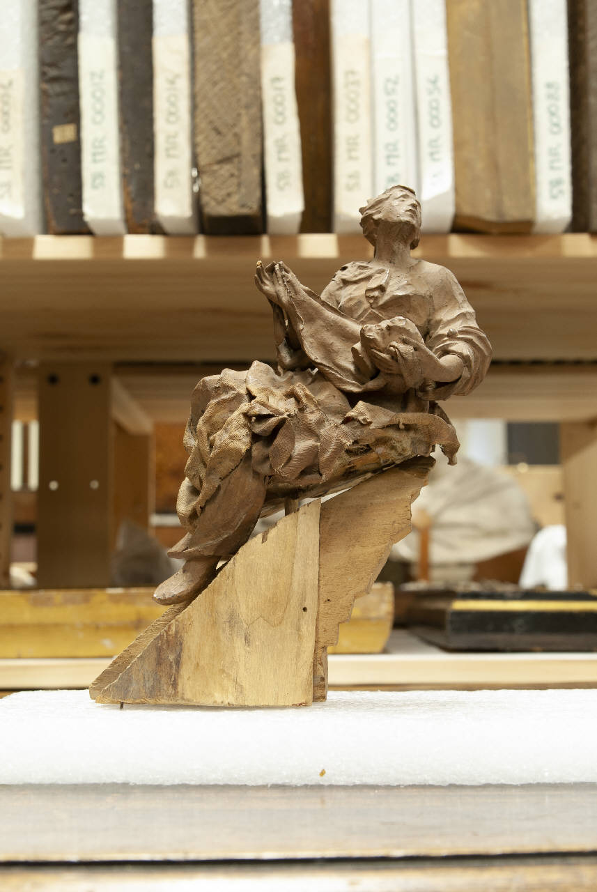- NOTIZIE STORICO CRITICHE Insieme a "Santa con modello di chiesa" (num. inv. 58SC00041b) e a "Melchisedec" (num. inv. 58SC00041c) anch'essi conservati in Accademia Carrara, questa "Santa Grata con la testa di Sant'Alessandro" dovrebbe essere il bozzetto per una statua da porre sull'ancona di un altare. Straordinariamente risolti nonostante le piccole dimensioni, i tre manufatti evidenziano, oltre alle qualità manuali della bottega fantoniana, anche l'importanza della statuaria indipendentemente dalla sua collocazione spaziale all'interno di una struttura architettonica come l'ancona. Precedentemente datati al 1750 ca., il confronto stilistico con alcuni manufatti simili prodotti sempre dalla bottega fantoniania consente di anticipare la collocazione cronologica alla prima metà del Settecento.