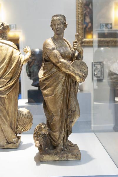 - NOTIZIE STORICO CRITICHE Cibele, solitamente raffigurata seduta su un trono, è qui ritratta in piedi, con un ornamento cilindrico sul capo, mentre regge tra le mani un cembalo. Il leone, attributo immancabile, è ai suoi piedi. Insieme al pendant raffigurante "Giunone" (n. inv. 98ZR00039) anch'esso conservato in Accademia Carrara, è data da F. Zeri ("Il conoscitore d'arte...", 1989, pp. 66-67) a Camillo Pacetti, uno degli artisti più celebri dell'Italia napoleonica, apprezzato dallo stesso Bonaparte. Viste le ridotte dimensioni, non sarebbe sbagliato considerare l'opera un bozzetto preparatorio per una grande scultura in bronzo dorato. Tuttavia, l'eccezionale livello di finitura e la doratura stessa, quasi certamente originale, farebbero pensare più da una scultura in sé finita. Databile tra il 1805 e il 1815, la terracotta risente ancora dell'influenza dei modelli di Antonio Canova, grazie al quale Pacetti ottenne la cattedra di scultura all'Accademia di Brera.