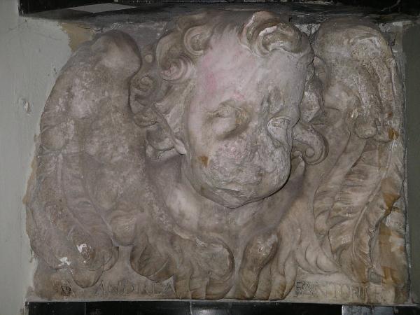 - NOTIZIE STORICO CRITICHE Questa scultura, quasi certamente realizzata da Andrea Fantoni in pendant con l'altra presente in Accademia Carrara (num. inv. 06SC00045) e di cui il cattivo stato di conservazione impedisce una valutazione più precisa, sembra essere realizzata entro un'incorniciatura modanata che farebbe pensare ad una decorazione presente nei modiglioni laterali di un altare. Raffigura la testa di un cherubino, soggetto ampiamente diffuso nella produzione fantoniana.
