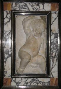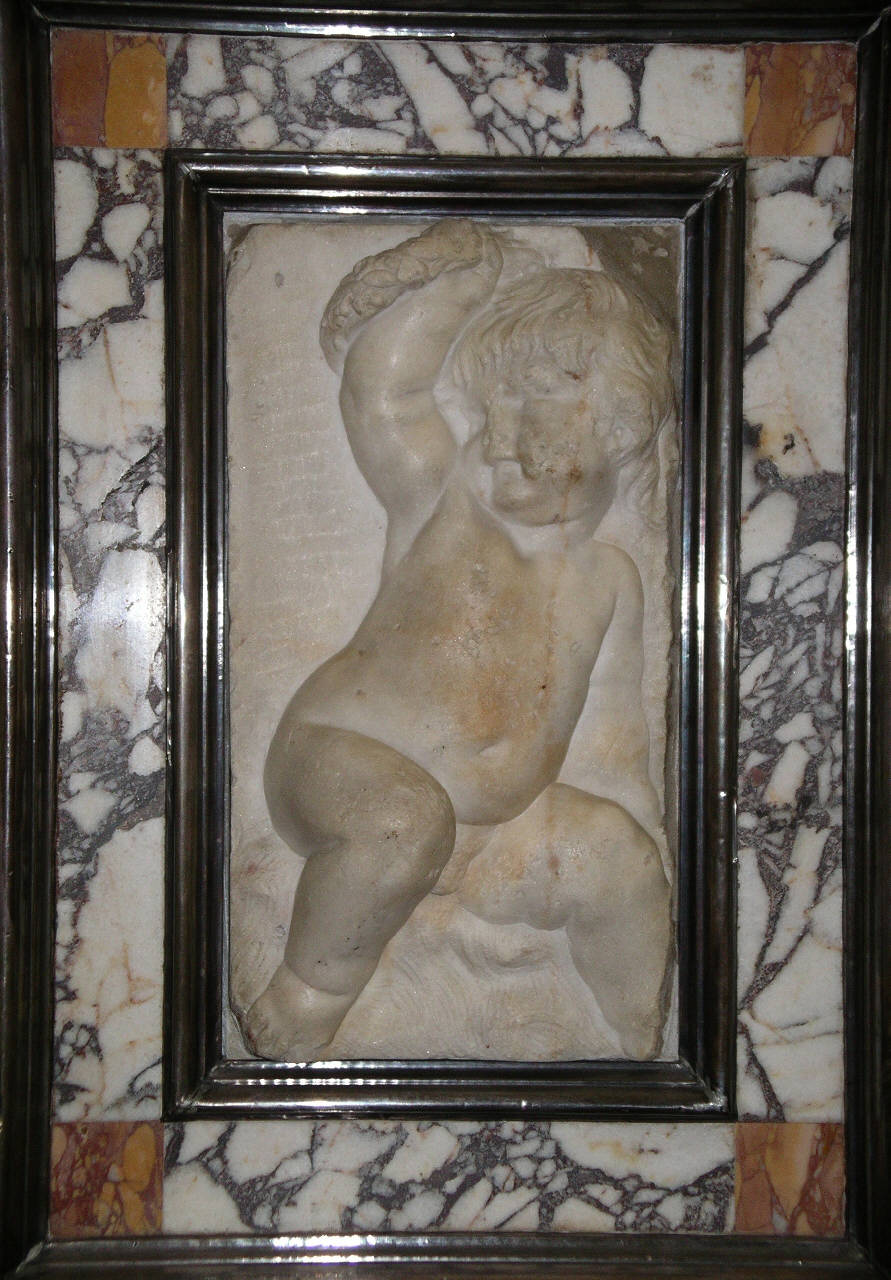- NOTIZIE STORICO CRITICHE Il rilievo, montato in una cornice in marmo rosso venato e marmo ocra maculato, è completato a tergo da pietra grigia. Raffigura un putto seduto, con la testa rivolta verso destra, mentre regge una ghirlanda al di sopra del capo.\nRiconosciuto da F. Zeri a François Duquesnoy, uno degli esponenti di punta del classicismo romano, il bassorilievo fu reso noto da A. Nava Cellini (1966, pp. 38-40). Realizzato intorno al 1628-1629, insieme all'Angioletto con drappo (n. inv. 98ZR00010) sempre di Duquesnoy e conservato in Accademia Carrara, questo putto mostra stringenti affinità con le due redazioni principali, quella in stucco della Galleria Spada e quella in marmo della Galleria Dora Pamphili dell'Amor divino che atterra l'Amor Profano, nonché con putti che popolano i due Baccanali Chigi realizzati da Nicolas Poussin intorno al 1626.("Il conoscitore d'arte...", 1989, pp. 34-35). La datazione precedentemente proposta intorno al 1626-1627, la leggera variazione delle dimensioni e soprattutto delle proporzioni delle figure, aveva fatto pensare che i due manufatti della Carrara non facessero parte stesso complesso.