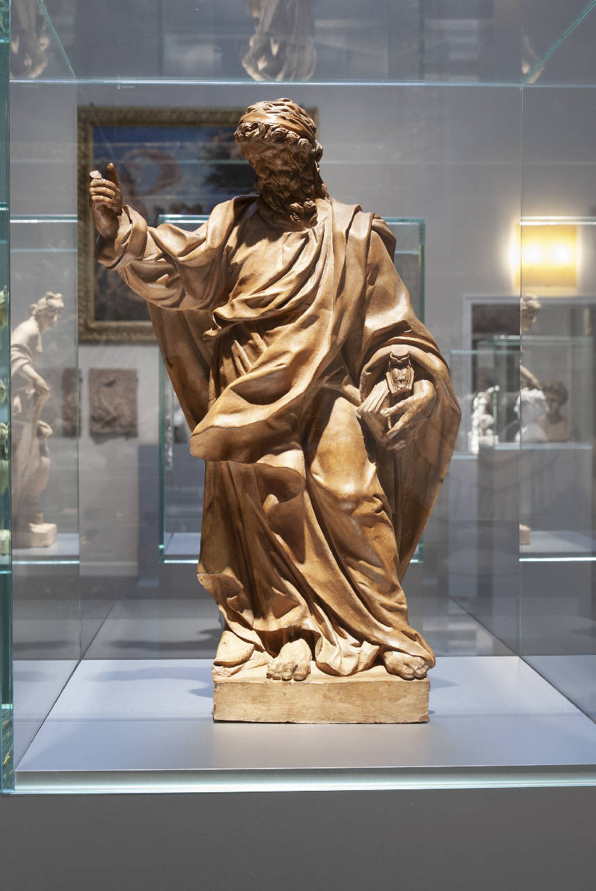 - NOTIZIE STORICO CRITICHE Questa terracotta di piccole dimensioni raffigura San Paolo con i suoi tipici attributi. Le affinità riscontrate con alcune opere di Giuseppe Lironi (1679-1749), scultore di origine svizzera attivo a Roma nella prima metà del Settecento, come la "Madonna col Bambino" in travertino collocata sopra la colonna in piazza S. Maria Maggiore e la "Prudenza" scolpita tra il 1734 e il 1736 per la Cappella Corsini in S. Giovanni in Laterano, avevano consentito di collocare il manufatto nell'ambiente romano della prima metà del Settecento ("La donazione Federico Zeri", 2000, pp. 52-53). Recentemente ("Il Museo in dono..., p. 33), è stata avanzata l'ipotesi che si tratti dello studio preparatorio per una grande statua di San Paolo posta sulla facciata del Duomo di Siracusa datata 1757 ed opera dello scultore Ignazio Marabitti, uno dei maggiori scultori siciliani e ultimo importante caposcuola di bottega a Palermo.