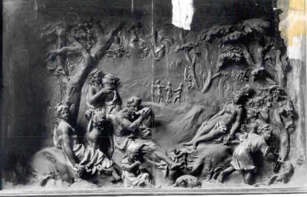 - NOTIZIE STORICO CRITICHE Proveniente dalla collezione del conte Giacomo Carrara, questo rilievo in terracotta è incassato in una cornice in legno modanato, dorato e dipinto a finta radica. L'opera, che è in pendant con "Il bagno di Diana e Atteone" (num. inv. 58SC00031) è riferita tradizionalmente ad Andrea Fantoni e alla sua bottega intorno al 1720-1730 ca. Definita genericamente scena pastorale, si tratta quasi certamente di un episodio legato a Bacco, come fanno pensare i grappoli d'uva e le molte figure in atteggiamenti amorosi e festanti. Le donne sarebbero le Baccanti che celebrano riti e balli in onore del dio. Non è escluso possa trattarsi dell'episodio di Bacco e Arianna, narrato da Ovidio, come la storia di Diana e Atteone, presente sul rilievo gemello.