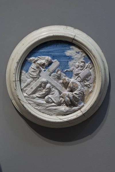 - NOTIZIE STORICO CRITICHE Montata in una cornice in legno modanato laccato di bianco, questa terracotta raffigura la settima stazione della Via Crucis: sulla via al Calvario, Gesù cade per la seconda volta sotto il peso della croce.\nIl tondo, insieme all'altro in collezione Zeri anch'esso conservato in Accademia Carrara (n. inv. 98ZR00018), faceva parte di una Via Crucis in terracotta invetriata ordinata dal Granduca Cosimo III Medici ai giovani artisti che allora frequentavano a Roma l'Accademia di Belle Arti da lui fondata. Alla serie parteciparono Anton Francesco Andreozzi, Giovan Camillo Cateni, Francesco Ciaminghi e Giuseppe Piamontini. Ciro Ferri avrebbe dovuto sovrintendere all'impresa, fornendo i disegni e seguendo i giovani scultori. Collocata all'aperto lungo la via di accesso alla chiesa del convento di San Pietro d'Alcantara, edificato a partire dal 1678 a Montelupo Fiorentino, la Via Crucis fu poi smantellata nel 1785 (in sito restano solo tre tondi). Le due stazioni in collezione Zeri sarebbero da identificare con i numeri 7 e 8 di una nota spesa di Apollonio Bassetti (Miscellanea Medicea, 368 carta, 1272 verso), segretario di Cosimo III, nelle quale sono segnalati, oltre i soggetti dei bassorilievi, anche i nomi degli artisti a cui fu affidata l'esecuzione. Sulla base di questa nota M. Visonà identificò l'autore in Anton Francesco Andreozzi. L'uso della terracotta invetriata testimonia la volontà di restare fedeli alla tradizione ("Il conoscitore d'arte...", 1989, pp. 38-39).