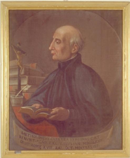 - NOTIZIE STORICO CRITICHE Donato all'Ateneo di Bergamo da Giovan Battista Cucchi, il dipinto ritrae Bartolomeo Carrara (Bergamo, 1707-Roma, 1778), cofondatore e appartenente all'ordine Teatino e autore di una dotta "Storia di Paolo IV". Eletto a Roma nel 1759 consultore dell'ordine e poi procuratore generale, rimase nel Convento di San Silvestro a Monte Cavallo fino alla morte. Aderì all'Accademia degli Eccitati a Bergamo. Il ritratto, riferibile all'ambiente bergamasco, fu con ogni probabilità realizzato appena dopo la morte avvenuta, come riporta anche l'iscrizione nel cartiglio, nel 1778. Il dipinto è inserito in una cornice di legno dorato. In Accademia Carrara è conservato un ritratto molto simile proveniente dalla collezione del conte Giacomo Carrara.\nCatalogo Rossi: 398/B49.
