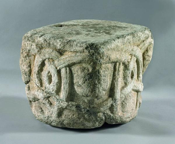 Capitello cubico con intrecci terminanti a foglie
