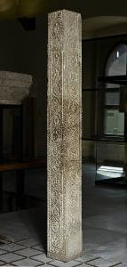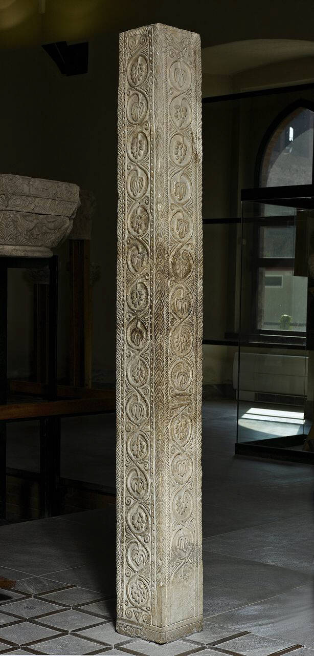 Pilastrino decorato su quattro lati a motivi vegetali. secondo uno schema che si ripete identico su ogni faccia: entro doppia cornice, la fascia mediana è occupata da un vaso posto in corrispondenza della base si generano sinuosi tralci sui quali si innestano rami terminanti alternativamente con foglie e grappoli d'uva; oppure i tralci si intrecciano tra loro formando una serie di cerchi con foglie iscritte. Alla sommità il motivo si conclude con un uccellino dal lungo becco o con due riccioli.