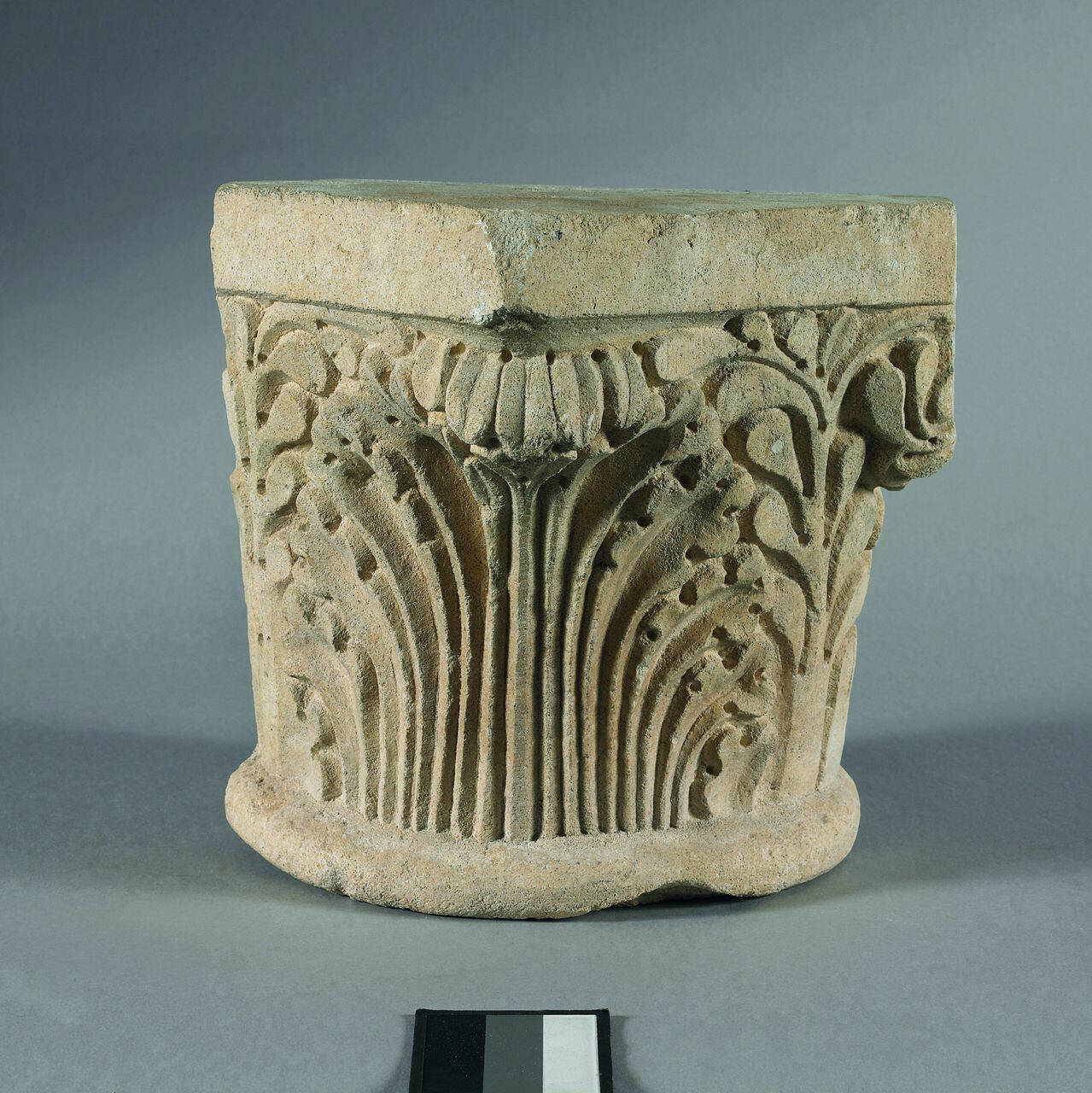 Capitello angolare di pilastro con collarino e abaco liscio. Calato a decorazione fitomorfa: una grande foglia d'acanto in asse con l'angolo del capitello. Ai lati si inarcano due fogliami con foglioline prive di nervatura.