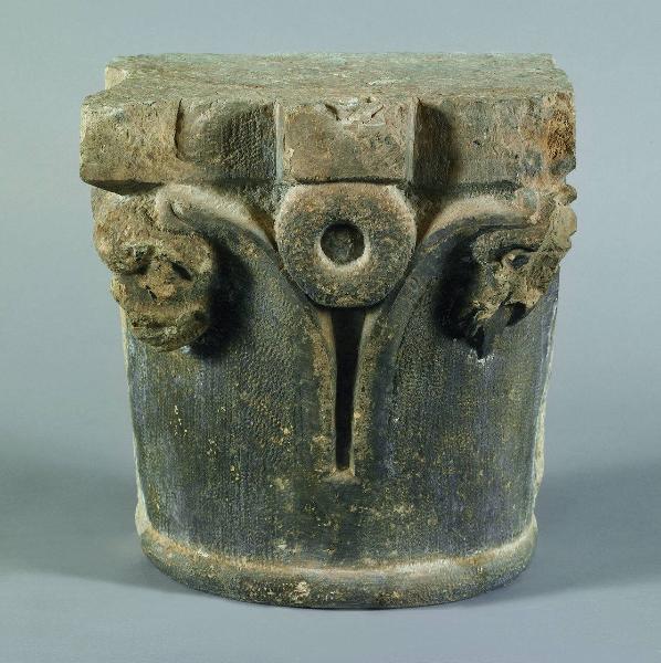 Capitello di pilastro con abaco liscio e collarino. Calato decorato da due foglie lisce dallo spessore esiguo e arricciamento zoomorfo. Agli angoli superiori e al centro tra le due foglie sono inseriti tre dischi a ciambella. La testa rimamente ha corte orecchie appuntite, fronte sporgente e lavorazione zigrinata della parte sovrastante le labbra.
