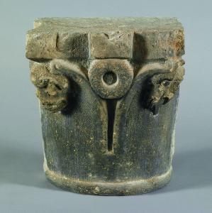 Capitello di semi colonna con tre corone circolari e bottone sotto l'abaco