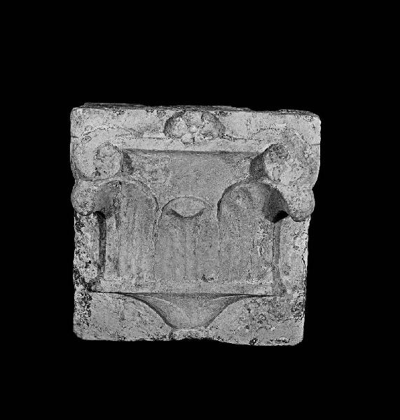 Peduccio di forma squadrata decorato a bassorilievo con motivo a tre foglie a nervature parallele. Pseudo echino a fascia terminante in due volute e con rosetta sovrastante.