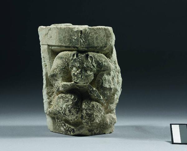 Capitello angolare di pilastro con mostro rampante a due corpi e un'unica testa sull'asse dello spigolo d'angolo. Le zampe terminano in uno stato di abbozzo sui lati del pezzo.