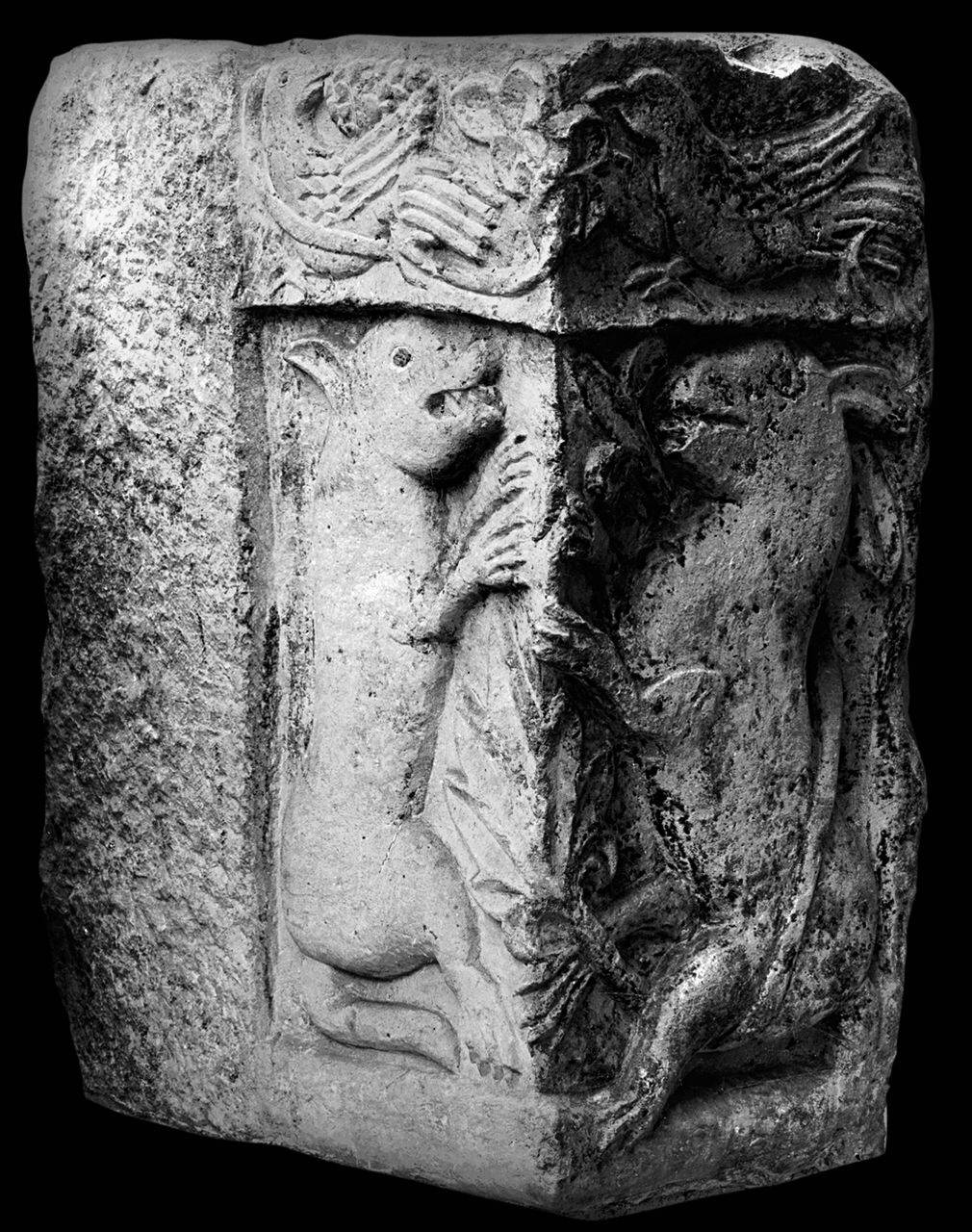 Capitello di semipilastro con animali rampanti (lepre?, cane?); abaco: uccelli.