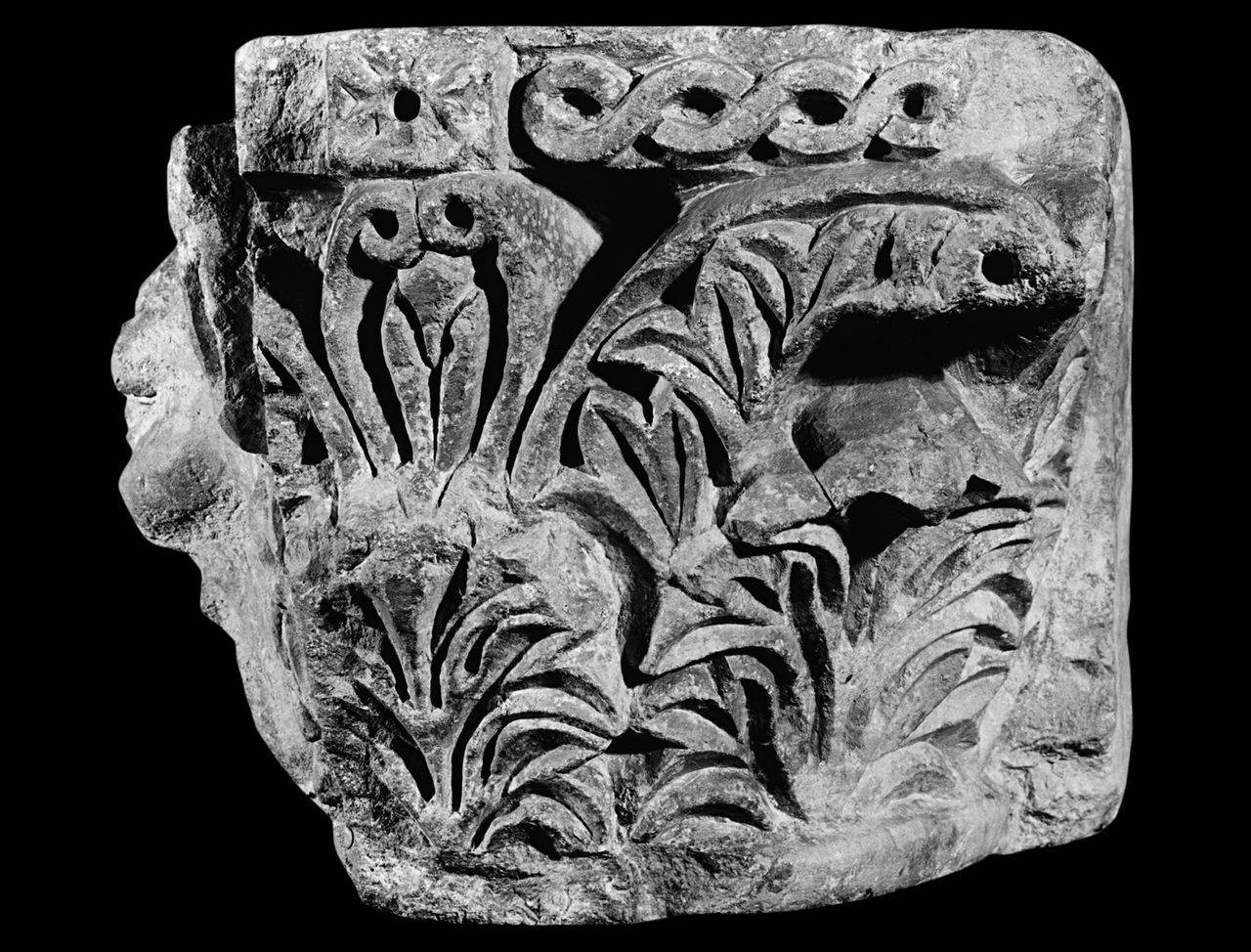 Capitello decorato a foglie; testa leonina su un fianco. Abaco decorato a nastro con un piccolo fiore.