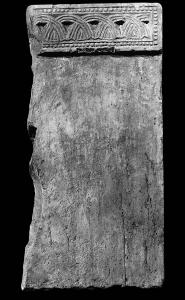 Frammento di transenna con fascia superiore decorata ad archetti intrecciati entro cornice di perline