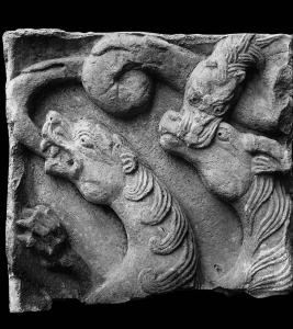 - NOTIZIE STORICO CRITICHE Frammento di lastra marmorea, con parte superiore del corpo di due mostri, una a testa ircina e l'altro a testa leonina e serpente che li attorce.\nIl pezzo è stato associato al gruppo proveniente da S. M. Beltrade (post 1926 - nota manoscritta in scheda inventariale)