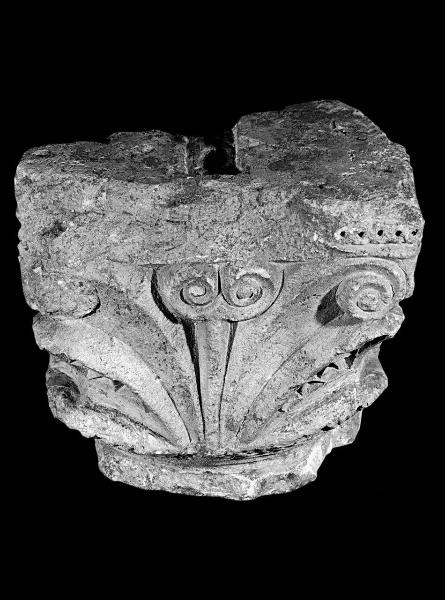 Capitello di semicolonna decorato a foglie con lavorazione concava: calato con volute agli angoli al di sopra di grosse foglie angolari scavate a motivi geometrici. Collarino decorato a nastri intrecciati.