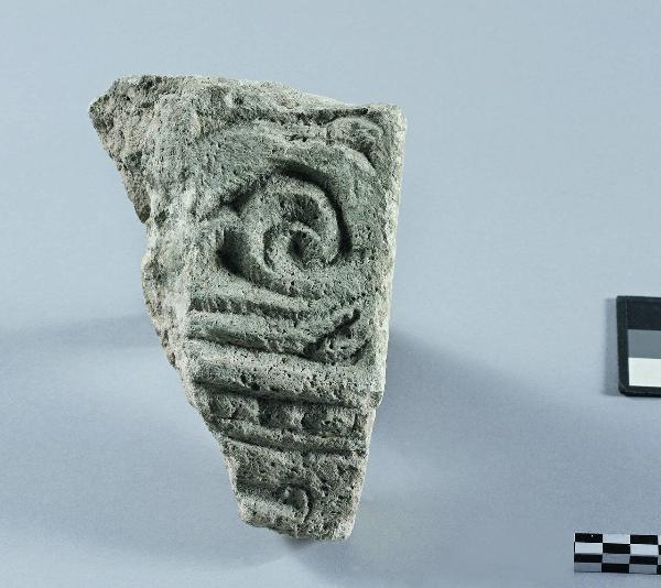 Elemento di forma irregolare che presenta una decorazione a spirale seguita da una modanatura a perline.