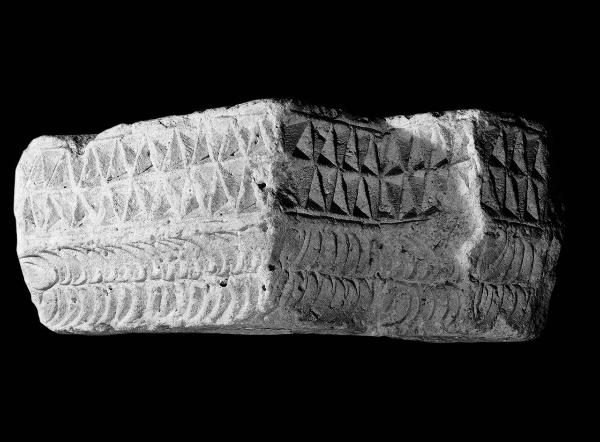 Frammento di pulvino decorato in due zone a motivi geometrici e stilizzati.