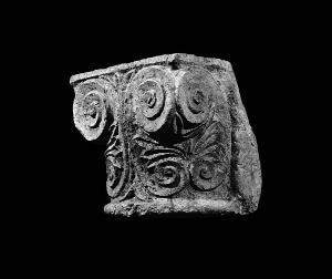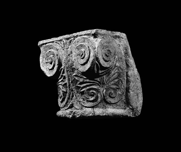 Capitello di mezza colonna decorato a foglie con grandi volute agli spigoli