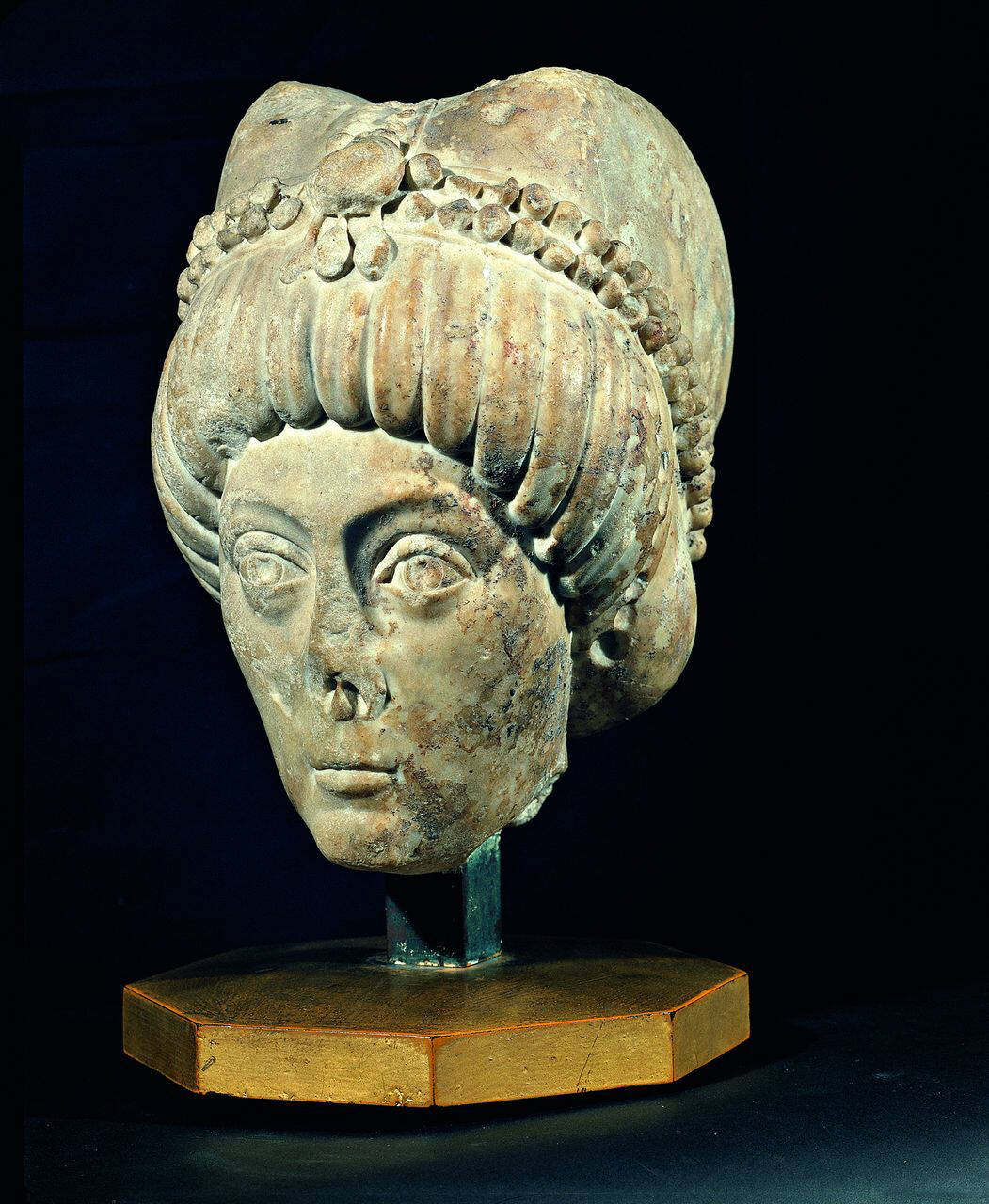 Testa femminile, detta di Teodora con ricca corona decorata con doppia fila di perle/gemme.