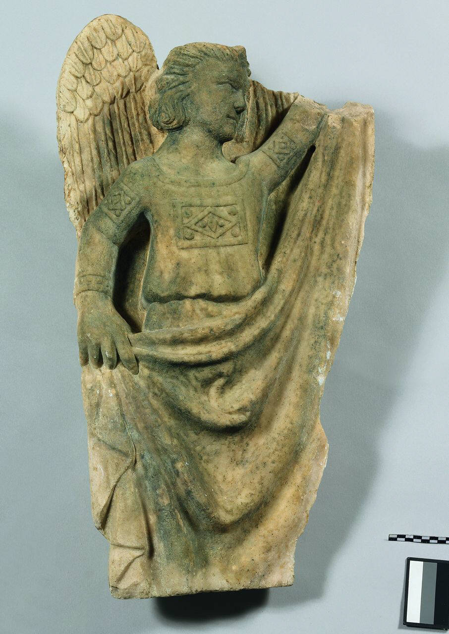 Angelo reggicortina rivolto verso destra. La lastra è sagomata intorno alle ali.