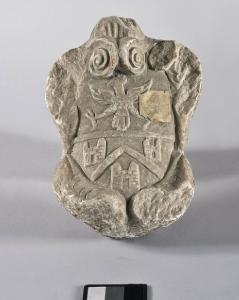 Stemma bipartito: aquila al capo d'impero; tre castelli biturriti, separati da elemento non identificato. Entro cornice frammentaria, modanata con volute nella parte superiore. Non è integro.