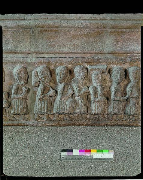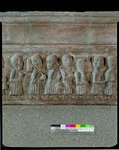Parte del fregio della distrutta Porta Romana, raffigurante Sant'Ambrogio che scaccia gli Ariani da Milano. La scena si sviluppa dal fianco verso la fronte del pilastro. Sant'Ambrogio, preceduto da un chierico con una croce astile, è posto a sinistra, in abiti pontificali, con la mitria sul capo, mentre percuote con uno staffile un ariano, ultimo di un corteo di diciotto personaggi (uomini, donne e bambini). Nel listello sopra il fregio vi è un'iscrizione che suggerisce il soggetto, mentre nella cornice sommitale vi è un riferimento allo scontro del presule contro gli Ebrei, a cui Sant'Ambrogio avrebbe fatto distruggere le sinagoghe.