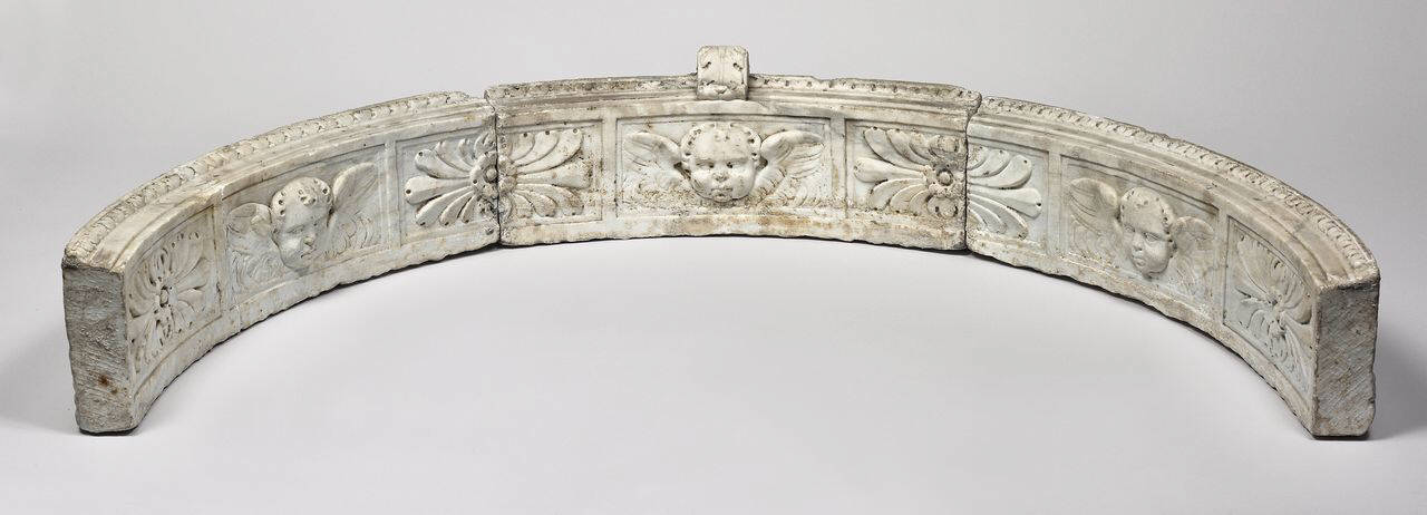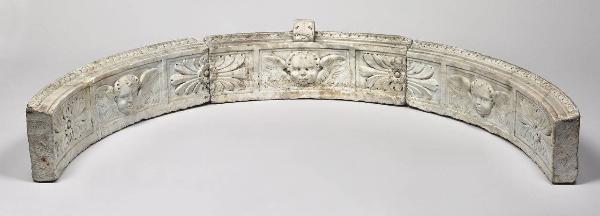 Ognuna delle tre parti presenta tre riquadri: testa di cherubino alternata a due foglie di acanto contrapposte e unite da fiore. Il profilo esterno aggettante è decorato a coppie di linguette.