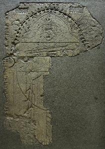 Lastra tombale frammentaria relativa a Giovanni Lanfranchi da pisa podesta di Milano; la figura in abito talare regge una spada ? e una bilancia a stadera con peso ottagonale.\nIscrizione: [in] hoc tumulo..... in pace