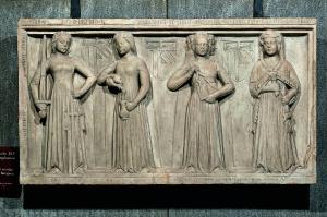 - NOTIZIE STORICO CRITICHE Frontale di sarcofago con le quattro figure delle virtù cardinali e bassorilievi e iscrizione commemorante il defunto conte Vieri da Bassignana.\nAlt. cm. 80; largh. cm. 145; proviene dalla distrutta Chiesa di San Dionigi in Milano\nCC 1924\n(vedi C.S. [Emilio Seletti] p. 266)