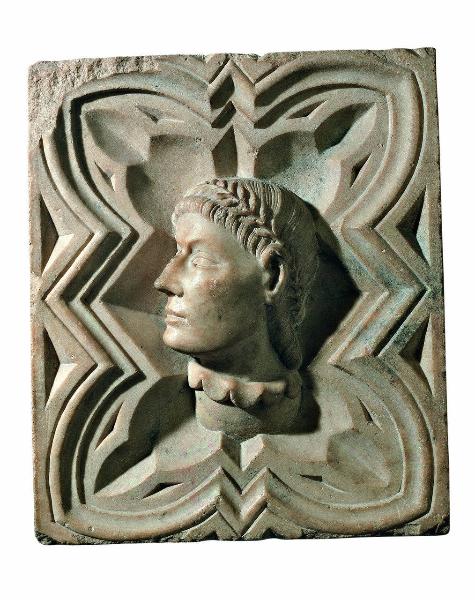 - NOTIZIE STORICO CRITICHE Testa virile volta a destra, quasi al vero laureata. ad alto rilievo. entro comparto decorativo gotico, di marmo.\nAlt. cm. 55; largh. cm 47.\nProv. ignota.\nCC 2306