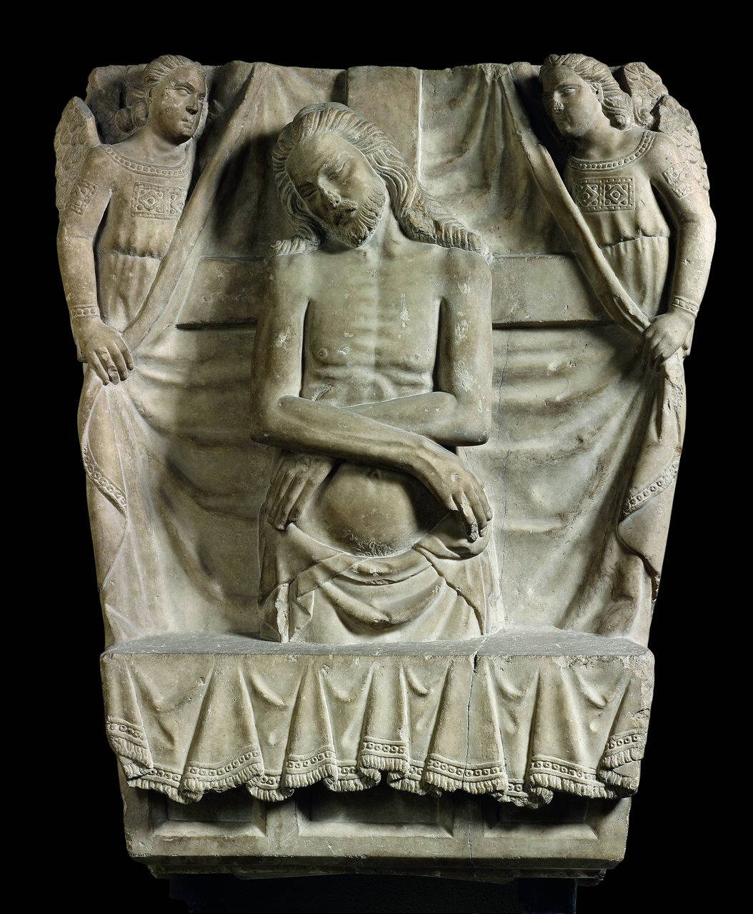 - NOTIZIE STORICO CRITICHE Chiave d'arco marmorea, decorata a bassorilievo raffigurante l'Ecce Homo a mezza figura tra due angeli in alto reggenti il lembo di un velario.\nAlt. cm 113; largh. inf. cm 65; largh. sup. cm 91
