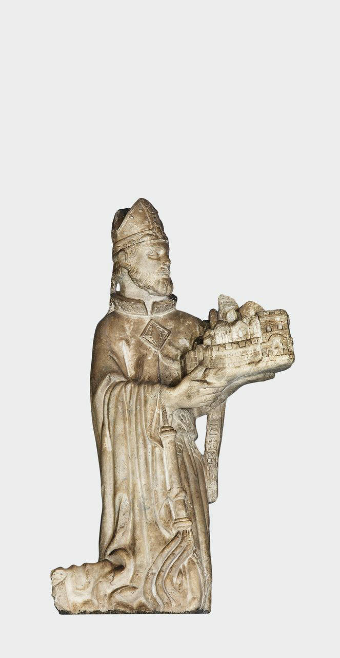 Sant'Ambrogio offerente porge il quartiere di Milano. Al braccio destro è appeso lo staffile. La parte del volto verso la parete è lavorata con maggiori dettagli di quella a vista.