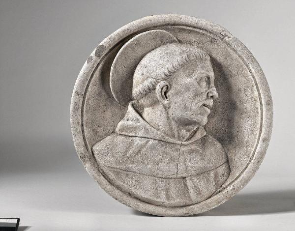 - NOTIZIE STORICO CRITICHE Medaglione ad incavo con entro ad altorilievo il busto di prospetto di un monaco sbarbato, col viso angoloso, volto leggermente a d. cocolla e manto diritto a pieghe. Scheggiature. (Scheda inventariale manoscritta)