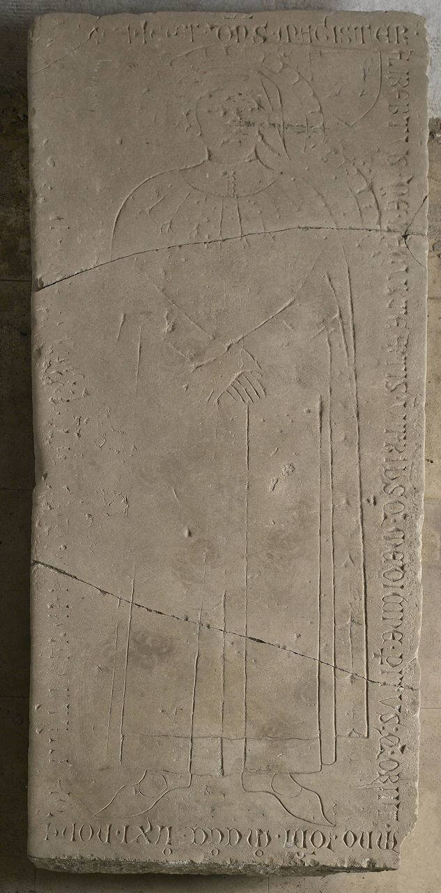 - NOTIZIE STORICO CRITICHE Lapide tombale del medico Aliberto de la Curte morto nel 1361, con figura graffita, del defunto ed iscrizione commemorativa. \nLung. cm 207 - largh. 87 - spess. 12\n(Dal Chiostro della Chiesa di S. Eustorgio in Milano).\nCC 3017\nVedi Bollettino 1889, pag. II, 12