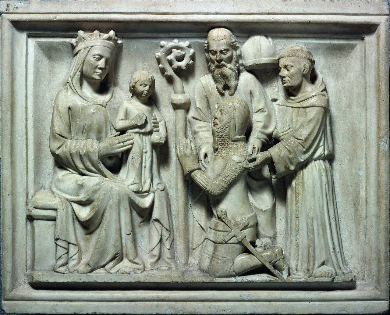 - NOTIZIE STORICO CRITICHE Bassorilievo raffigurante un duca di Milano? genuflesso davanti alla vergine col Bambino e S. Francesco e S...\nAlt. cm. 65 1/2 largh. 82\nSul fondo un pastorale ed una mitria. \nProv. ignota\nCC 2693
